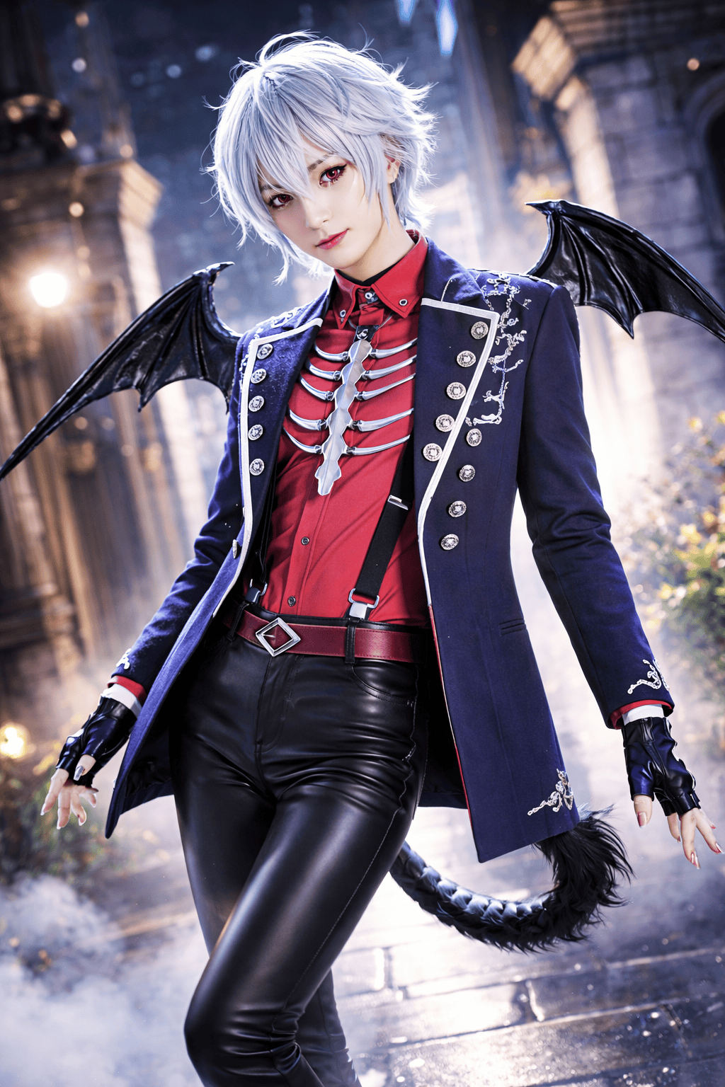 コート、シャツ、ズボン、ベルト、翼、尻尾、魚の骨飾り、悪魔角、サスペンダー、手袋